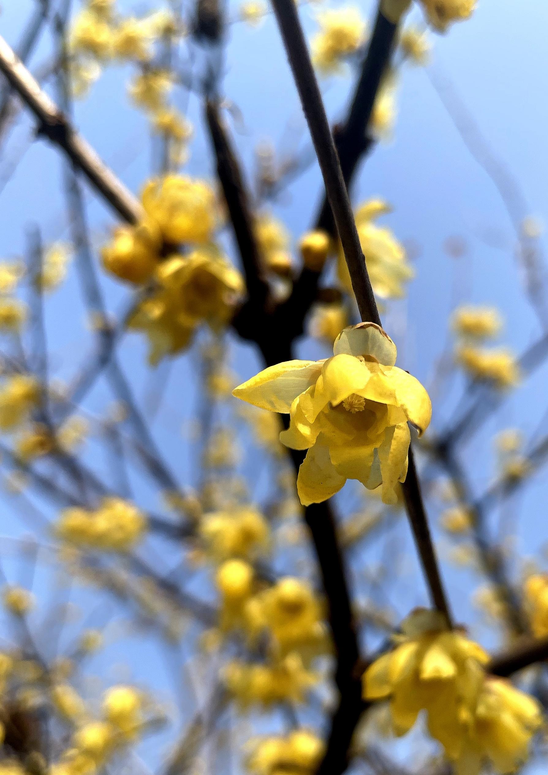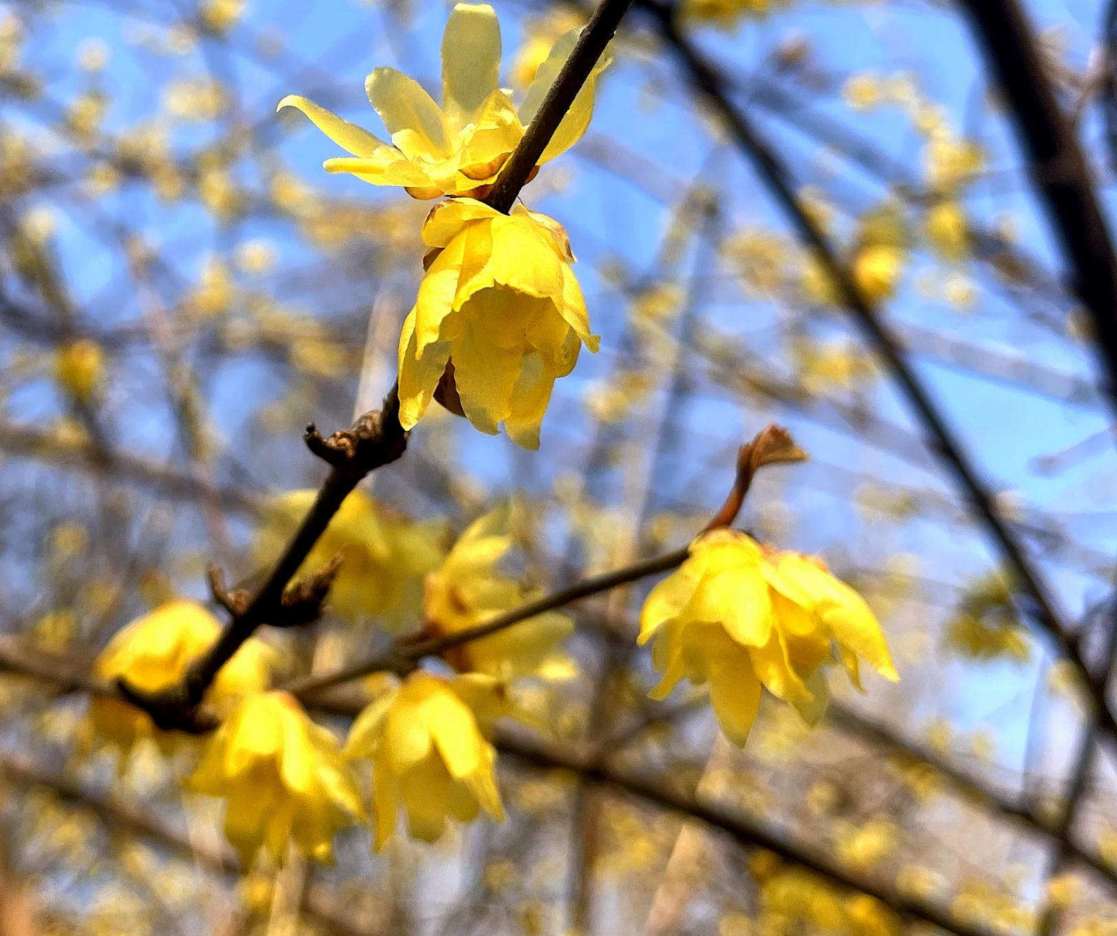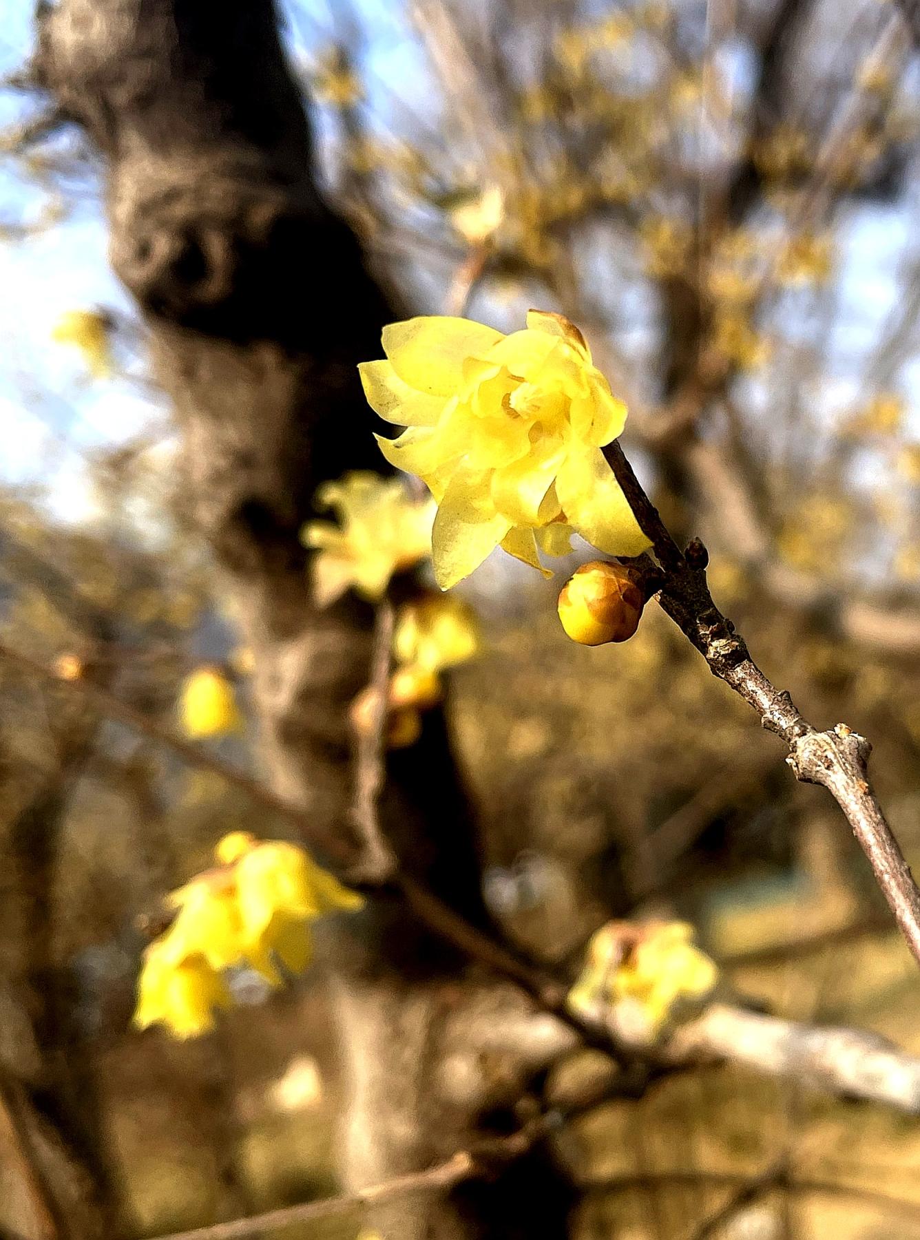 3月8日午后,散步营城建齐滨水绿谈,从金宫殿故址行至金中齐公园,沿路上天光水色,春意披露。在疏落的林木梵衲显暗澹的枝条丛中,一树树、一朵朵明黄色的蜡梅接踵敞开。