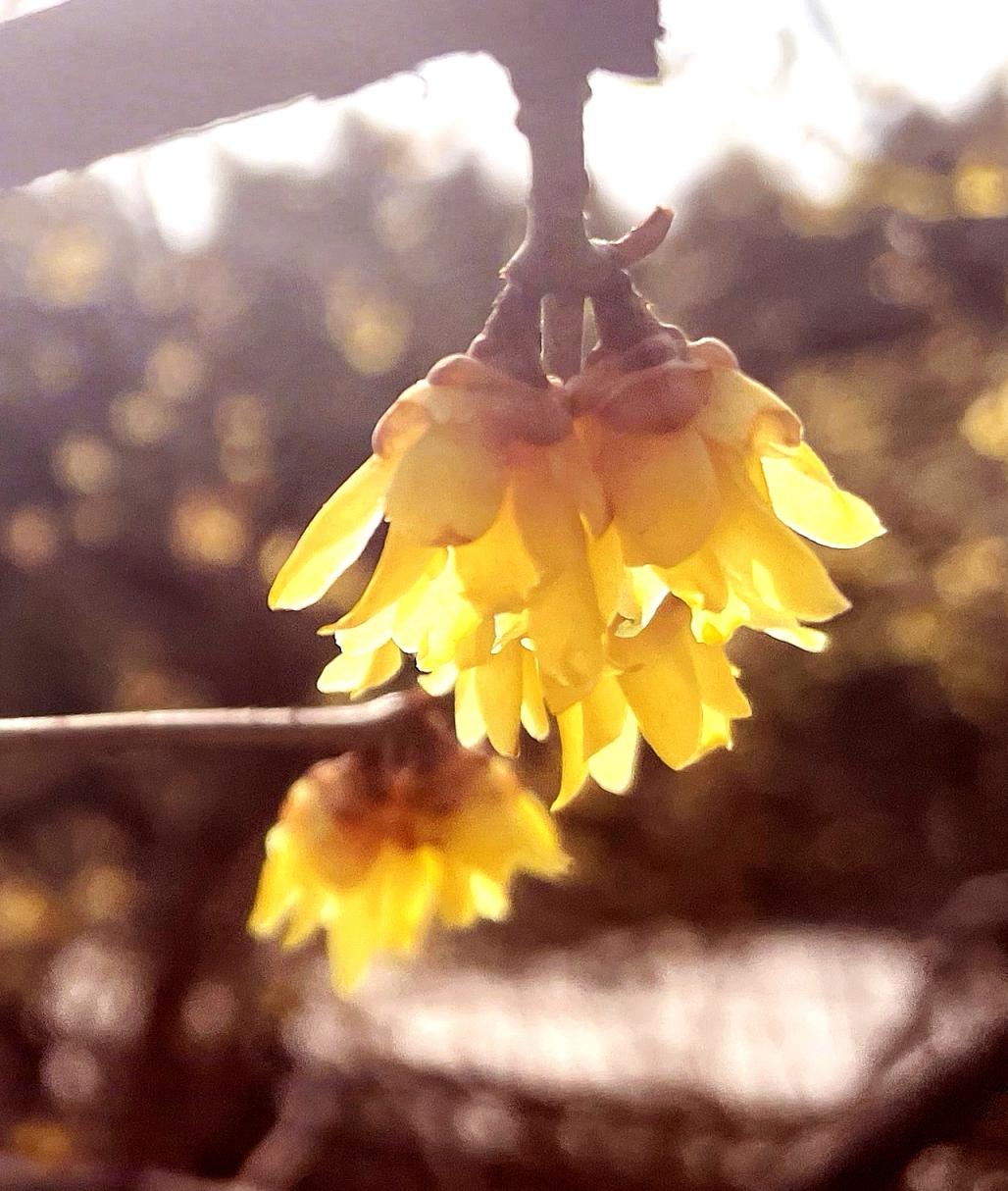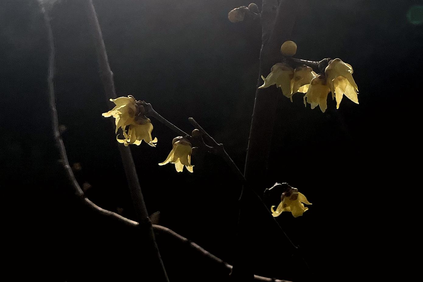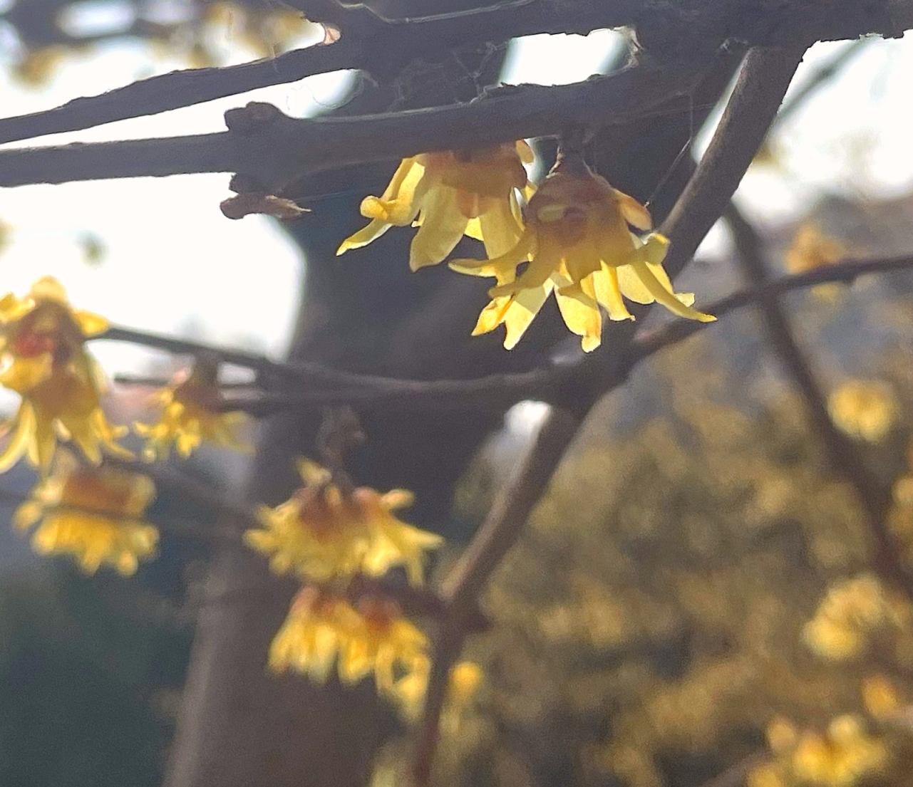 3月8日午后,散步营城建齐滨水绿谈,从金宫殿故址行至金中齐公园,沿路上天光水色,春意披露。在疏落的林木梵衲显暗澹的枝条丛中,一树树、一朵朵明黄色的蜡梅接踵敞开。